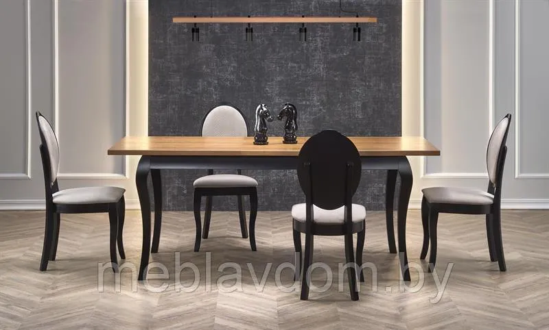 Представляем стол WINDSOR Halmar в стиле Людовика XIV. Столешница изготовлена ​​из шпонированной доски, что обеспечивает прочность и устойчивость к повреждениям. Чёрное деревянное основание идеально дополняет столешницу из тёмного дуба. Раздвижная функция решает проблему больших встреч с близкими. Стол достигает 200 см в длину.